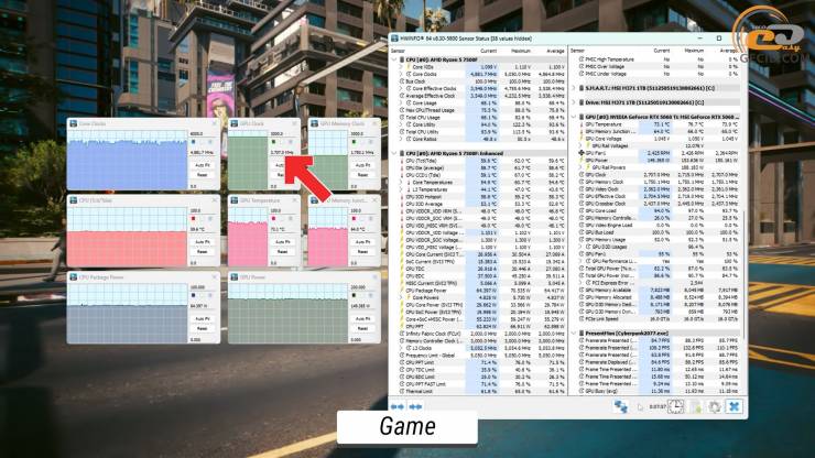 Проте з іграми система справляється очікувано тихіше, наприклад, у Cyberpunk 2077 температура CPU трималась біля 60 градусів, та й відеокарта була холоднішою: графічний процесор прогрівався до 76-ти, а VRAM тримала планку у 66 градусів. При цьому частота GPU зросла на 300 МГц у порівнянні із попереднім випробуванням, а вентилятор прискорювача скинув тисячу обертів за хвилину.