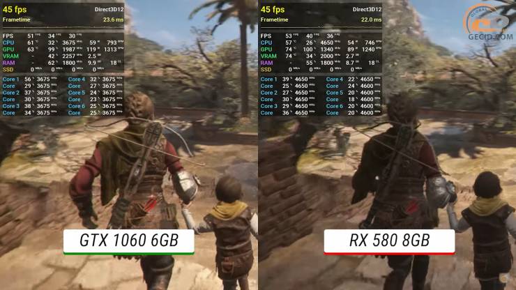 Після попередньої гри A Plague Tale: Requiem дає нам ляпаса і нагадує, що відеокартам майже по 6 років, тому на високі налаштування можна навіть не дивитись. У Full HD лише низька графіка, і бігом вперед. Хоча інколи можна і на кроки перейти, бо система просідає нижче 45 fps в обох випадках. Що цікаво, Radeon RX 580 у такому сценарії на 4-23% краща за опонента, тому дає більш плавний відеоряд і їсть на один з лишком ГБ менше ОЗП. Тоді як на стороні GeForce GTX 1060 - перевага в температурі GPU, він на 10°C з гаком холодніший, а також на диво - більшому енергоспоживанні. Загалом грати доволі приємно на обох картках.