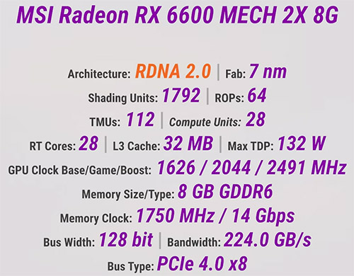Детально вивчати продуктивність даного відеоприскорювача ми будемо на прикладі MSI Radeon RX 6600 MECH 2X, реліз якої відбувся у вже далекому 2021 році. Тож давайте швидко пригадаємо її характеристики.