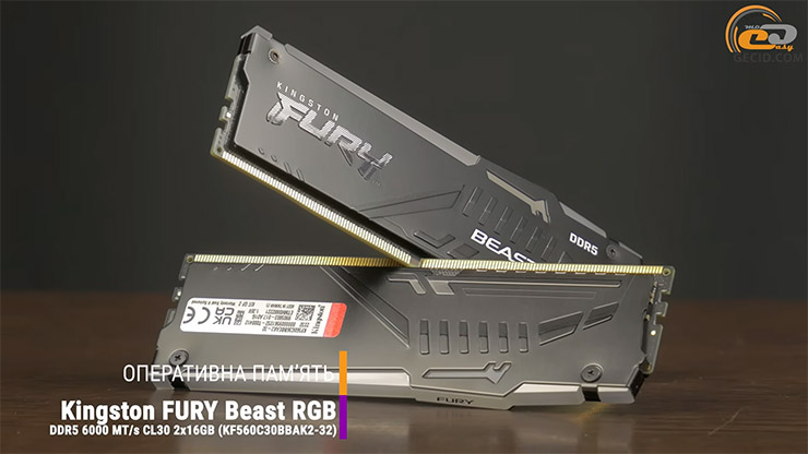 Як ОЗП використовувався яскравий комплект DDR5-6000 з двох 16-гігабайтних модулів Kingston FURY Beast DDR5 RGB, які ми прискорили в режимі 1:1 до 6400 МТ/с з таймінгами 32-39-39 після збільшення напруги живлення до 1,4 В.