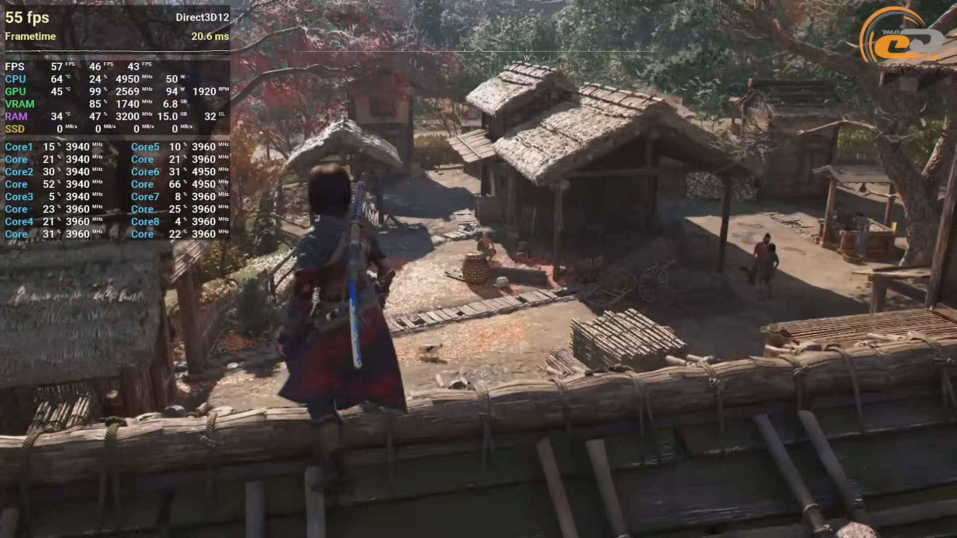 Тепер до Assasin’s Creed Shadows. На високому присеті графіки маємо досить комфортний ігролад та умовно достатню частоту кадрів. Адже інколи зустрічаються помітні просідання через велику кількість NPC або ж під час паркуру з даху на дах. А для отримання цих значень все ж таки доведеться застосувати функцію апскейлінгу в якісному режимі.