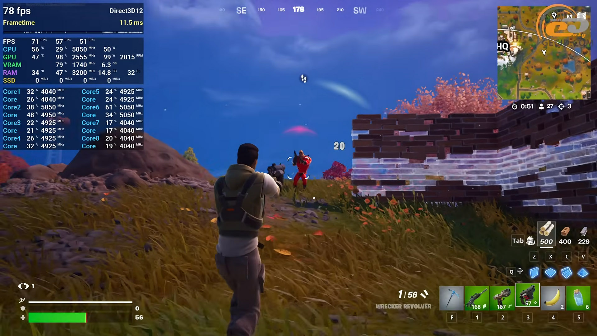 У Fortnite боротися за топ-1 буде зручно максимум на високих налаштуваннях графіки, якщо обходитися без допомоги апскейлеру — тож насолоджуємося нативною картинкою. Звісно, за бажанням, або при грі у рейтингових режимах завжди можна знизити графіку і отримати набагато більші значення у графі FPS на моніторингу.