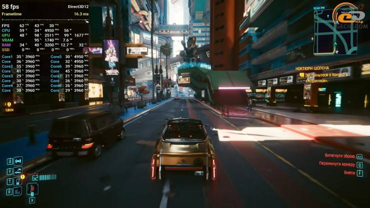 Так як піддослідна відеокарта, як і всі відеокарти на чипах AMD, не дуже добре порається з трасуванням променів, у Cyberpunk 2077 для комфортного ігроладу максимум доречним стає лише пресет графіки RT Low, та й то з використанням апскейлінгу FSR у якісному режимі. Так маємо досить приємну на погляд картинку разом із приблизно 60-тю кадрами за секунду, що надає повного відчуття комфорту від гри.