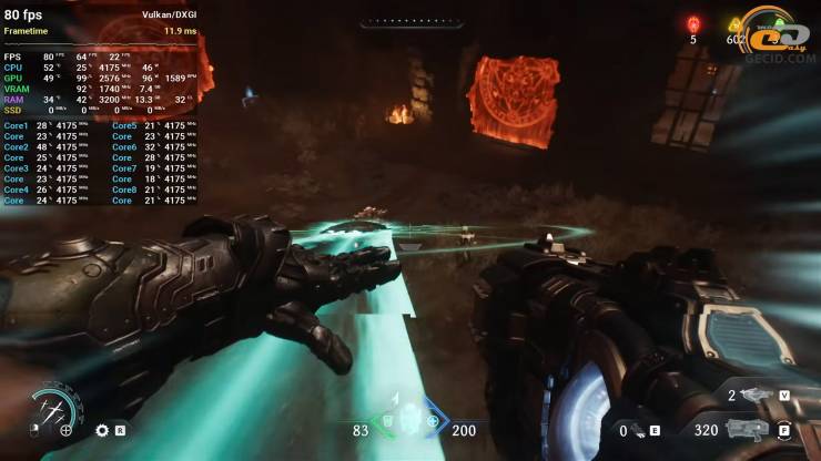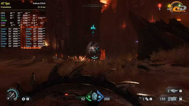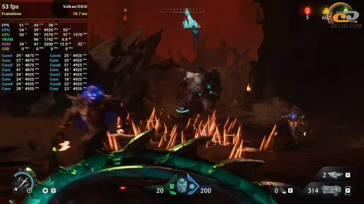 Новий DOOM: The Dark Ages на максимальному пресеті не радує великими числами на лічильнику FPS — маємо лише приблизно 45 кадрів на секунду з стрибками ще нижче під час важкий сутичок, які фактично і є основою цього шутера.