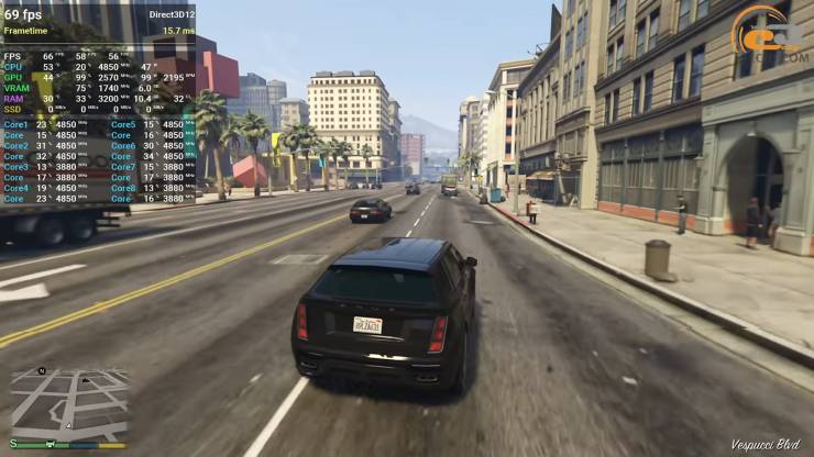 У оновленій п’ятій GTA RX 6600 не вдається подолати максимальний пресет графіки — тож обмежуємося Very High RT. При таких налаштуваннях не відчувається проблем у керуванні, як в місті, так і зонах густої рослинності, хоч у останній і зустрічаються моменти, коли картинка оновлюється менше 60 разів за секунду.