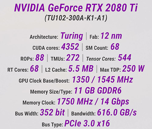 Розробники реалізували тут 4352 CUDA-ядра, аж 272 текстурних модулів, вдвічі більше тензорних ядер та 88 блоків растерізації. Щодо ядер, відповідальних за обробку трасування променів, то тут їх 68. Базова частота роботи GPU становить 1350 МГц, а бустова доходить до 1545-ти, що сьогодні вже не вражає. Трохи засмучують дуже маленькі 5,5 МБ L2-кешу та підтримка лише PCI Express 3-ого покоління для зв’язку з системою. Але, якщо повертатись до хорошого, то RTX 2080 Ti має 11 ГБ відеопам’яті типу GDDR6 та разом із досить широкою 352-бітною шиною утворюють чудові і на зараз 616 ГБ/с пропускної здатності. Рівень енергоспоживання ж тут вже не такий приємний і становить 250 Вт, тому розробники рекомендують мати блок живлення щонайменше на 600 Вт.