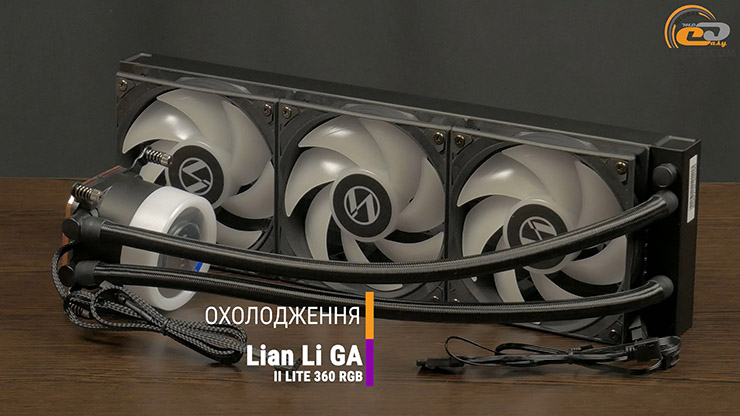 За охолодження CPU відповідає рідинна система Lian Li GA II LITE 360 RGB. Вона оснащена помпою, що працює на швидкості у 3800 об/хв для ефективного відведення тепла. Плюс поворотний ARGB-блок із зображенням логотипу надає стилю. На радіатор встановлено вентилятори з 28-мм профілем і підсвічуванням, котрі працюють на швидкості до 2500 об/хв, що гарантує потужне охолодження.