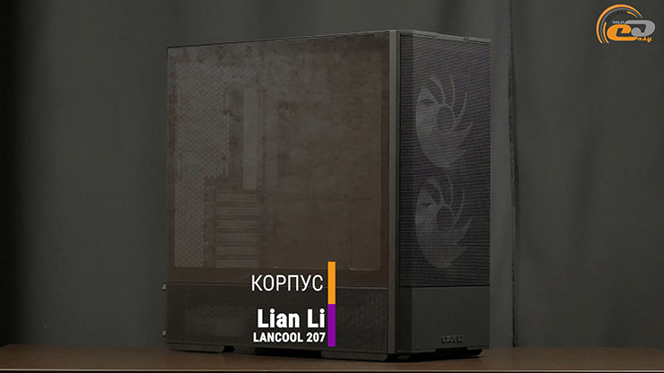 Усі ці комплектуючі розмістилися у відносно компактному корпусі Lian Li Lancool 207 з скляною панеллю. Але головне, в комплекті він має два 140-мм вентилятори на передній поверхні та стільки ж 120-мм над блоком живлення, що забезпечує чудову вентиляцію, особливо в зоні розміщення відеокарти. Цікавою деталлю є кронштейн для захисту відеокарти від провисання з вертикальним та горизонтальним регулюванням для підтримки різних прискорювачів.