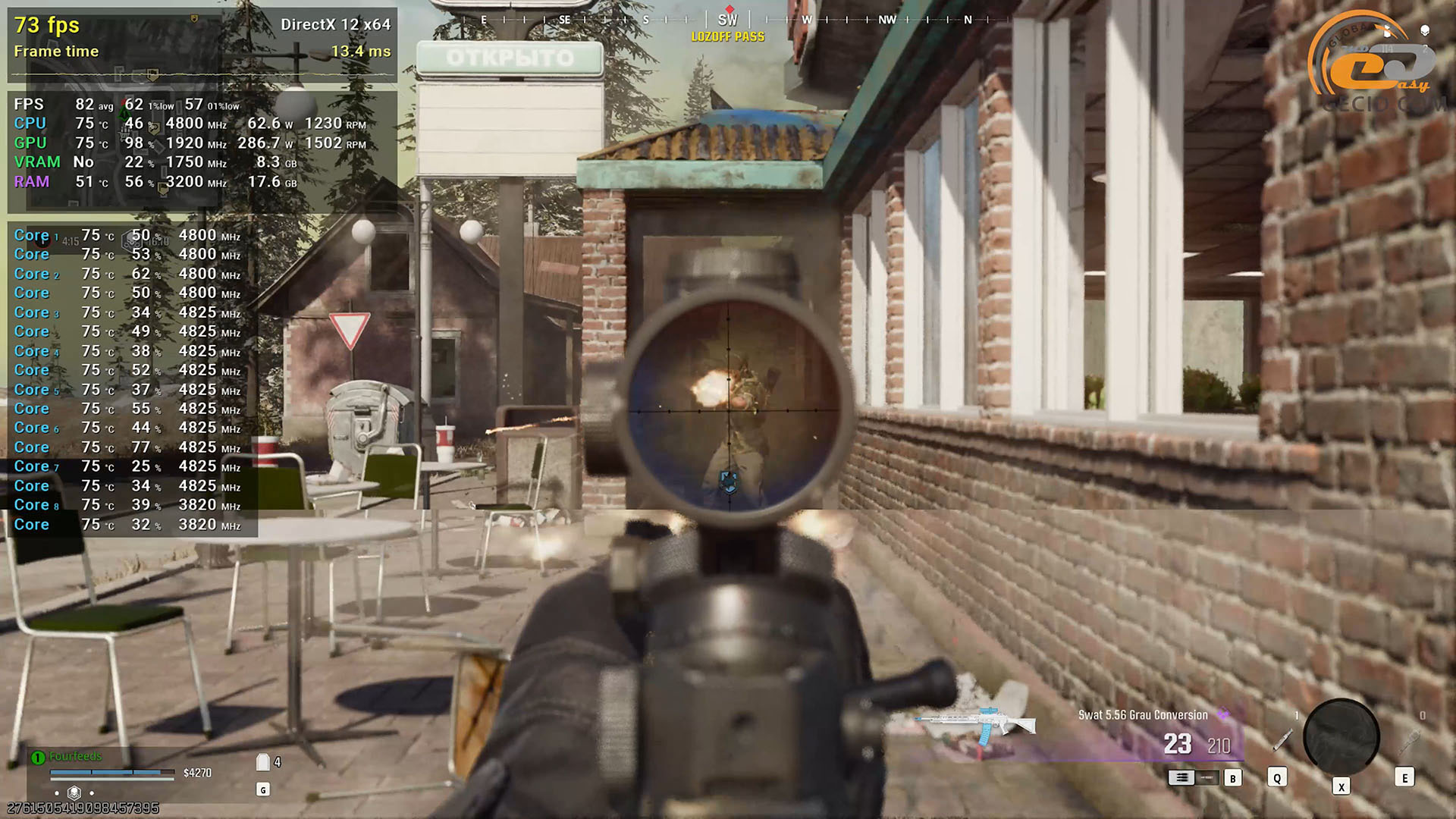 Також із задоволенням можна бігати і в Call of Duty: Warzone з екстремальною якістю зображення. Під час перестрілок чи великої кількості ефектів просліджується просідання частоти кадрів приблизно до 70-ти. Тому за бажанням «підбити» FPS до більш конкурентоспроможного можна піти шляхом вибіркового зниження налаштувань чи підключення DLSS.