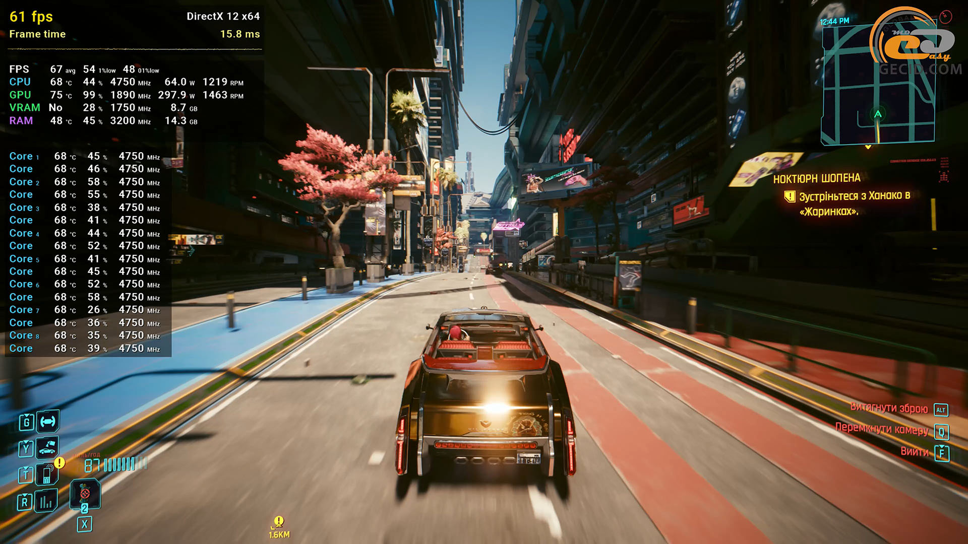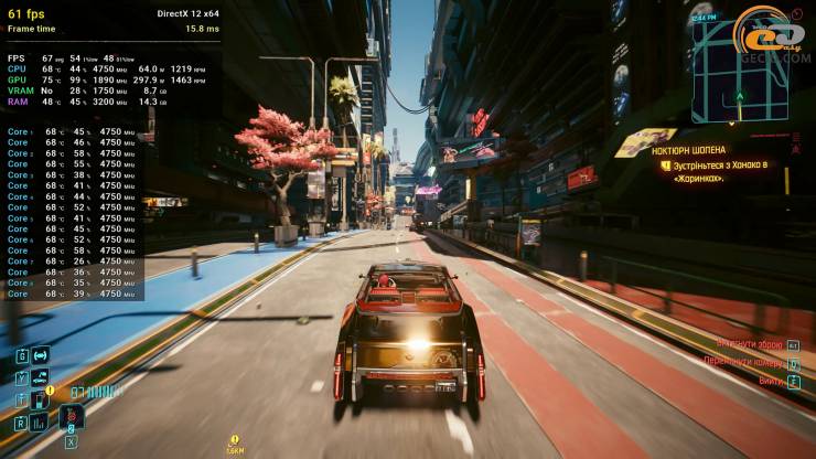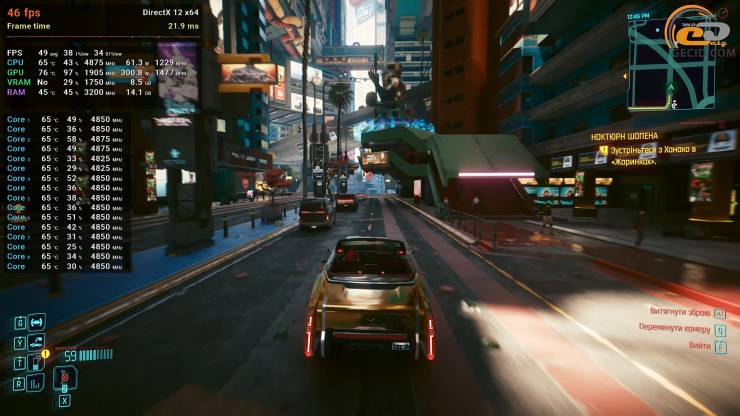 За бажанням пройти Cyberpunk 2077 з соковитою картинкою можна спробувати активувати пресет графіки RT Ultra, хоча й прийдеться заручитися допомогою DLSS аж у збалансованому режимі, який все ж таки погіршить чіткість тієї самої соковитої картинки. Але, навіть із таким розкладом середній FPS становитиме лише 50, що для когось може бути недостатнім.
