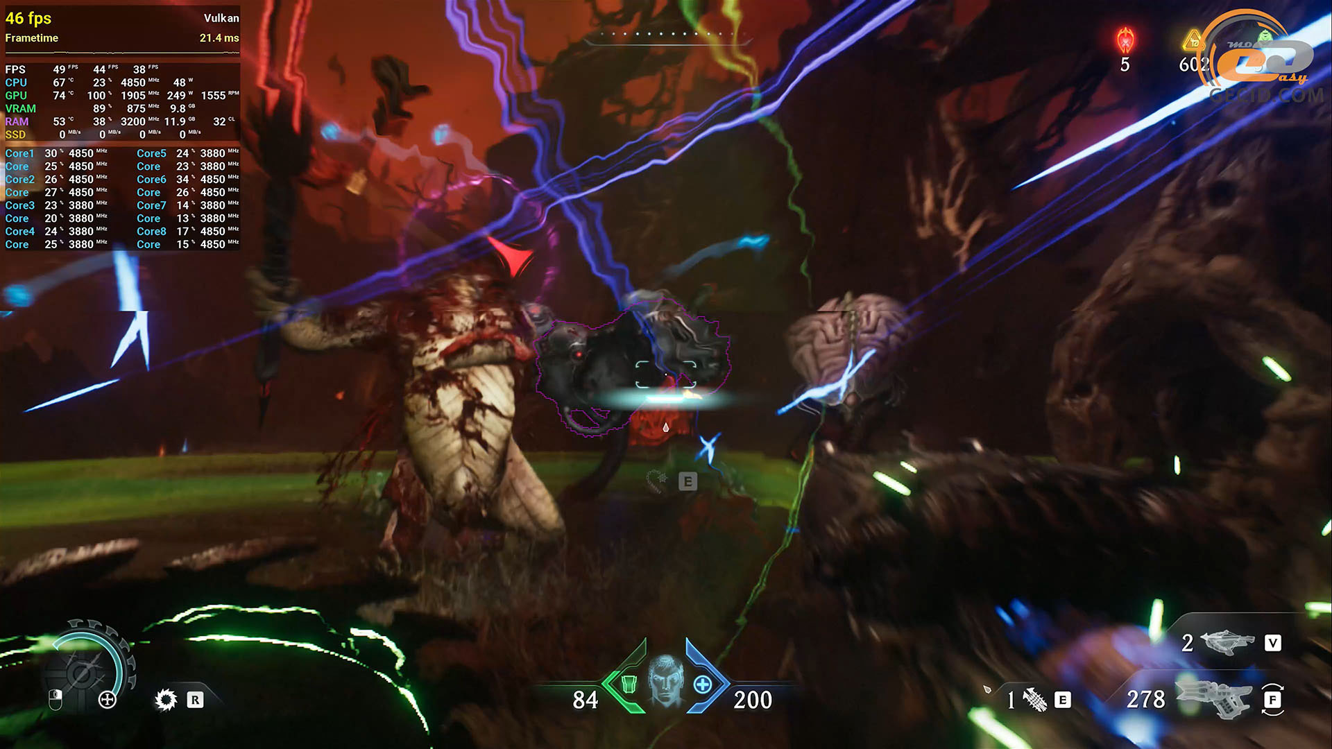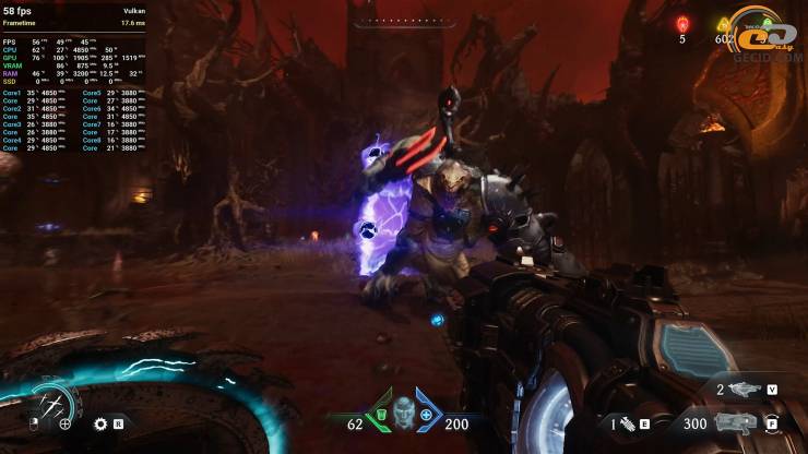Якщо не гнатися за трасуванням променів в DOOM: The Dark Ages, то відеокарта дозволяє винищувати усе на своєму шляху й на пресеті графіки Ultra Nightmare. Під час навіть важких сцен не простежується сильних просідань або ж посмикувань, але прийти до все ж таки 60-ти середніх кадрів за секунду допомагає DLSS в якісному режимі, при цьому, уникаючи будь-якого відчуття інпутлагу.
