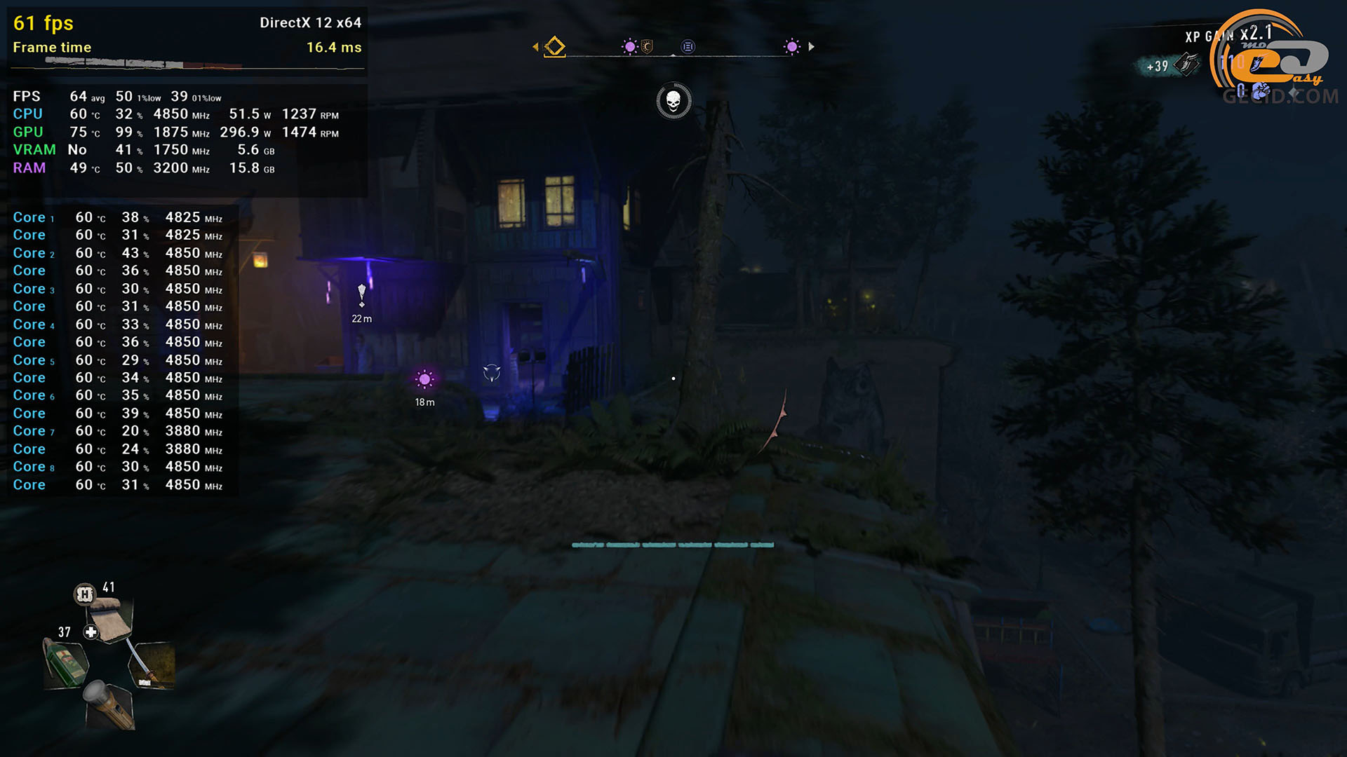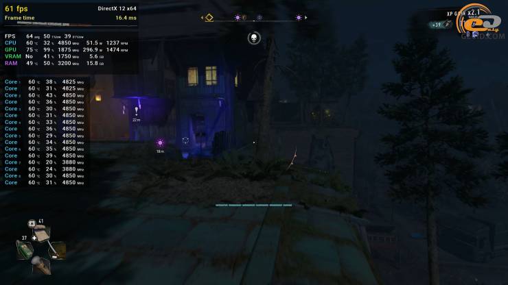 Паркуром у Dying Light 2 можна займатися на пресеті графіки High Quality RT, хоча все ж таки для комфорту потрібен DLSS в якісному режимі. Як результат, маємо більше ніж 60 кадрів за секунду навіть під час пробіжки нічним містом, коли активність мутантів навкруги найвища. Варто відмітити подеякі посмикування, на які вказує показник дуже рідкісних подій, але в реальності вони майже не відчуваються, тому усе ОК.
