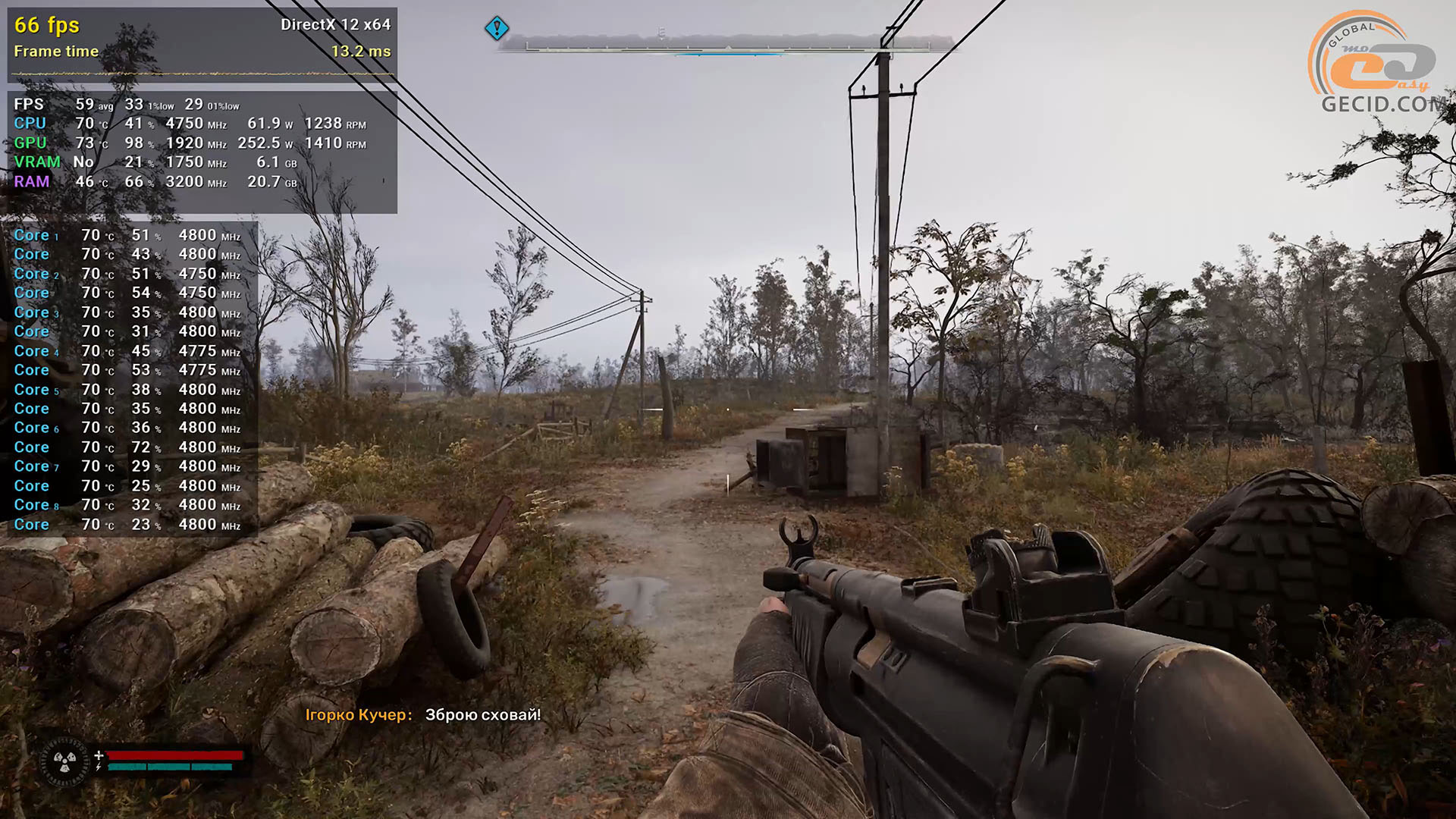 Важку S.T.A.L.K.E.R. 2: Серце Чорнобиля завжди хочеться запустити на якомога вищих налаштуваннях, тому в нашому випадку кращим поєднанням стає мікс високого пресету графіки та збалансованого режиму DLSS. На жаль, інколи приходиться миритися із помітними просіданнями FPS у локаціях з великою кількістю NPC. Проте у Full HD ситуація повинна бути помітно кращою.