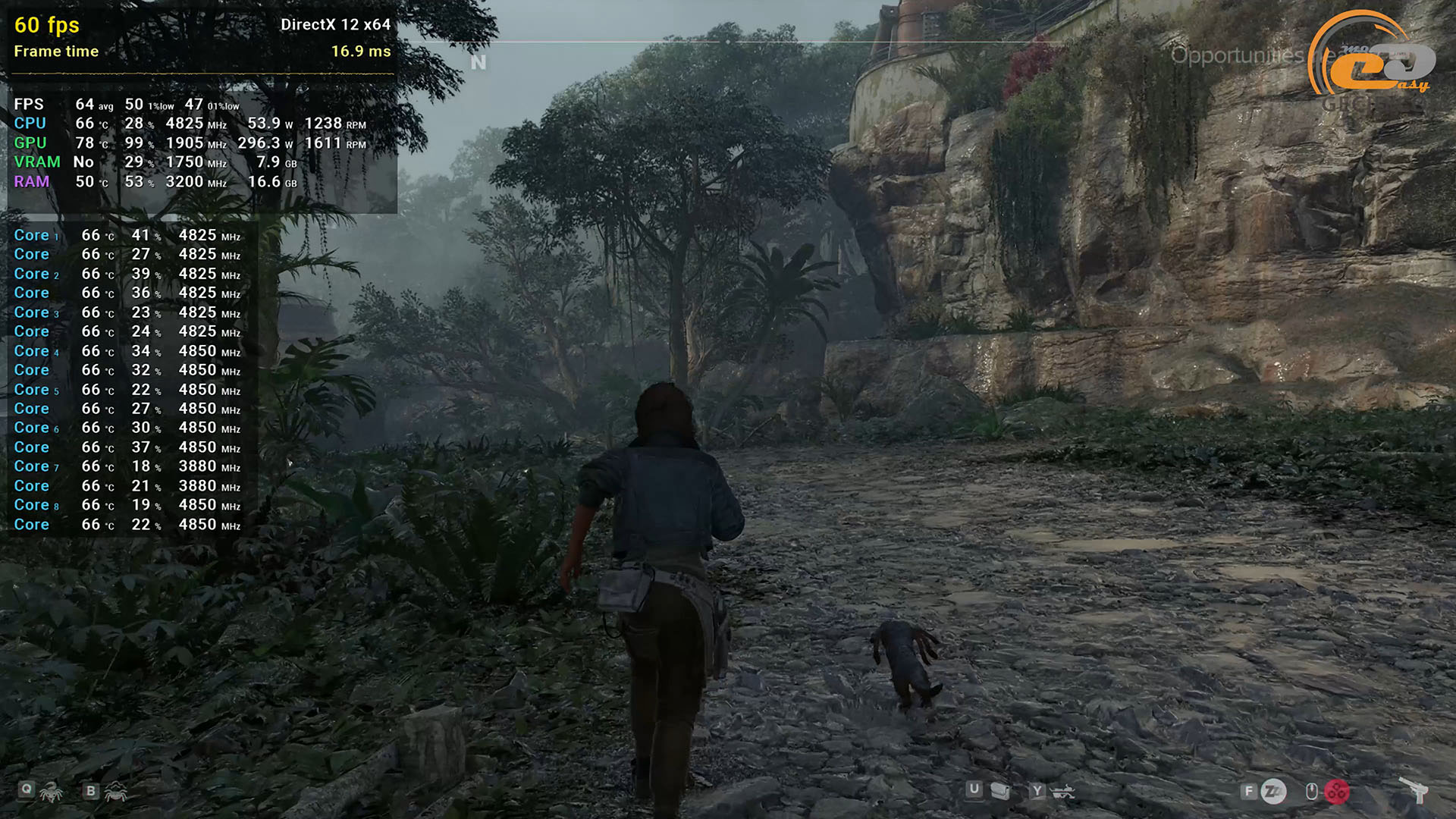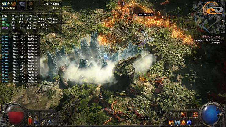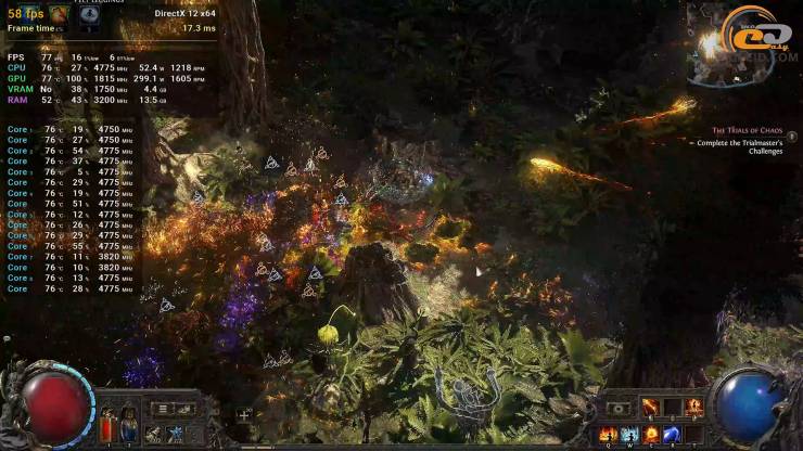 Path of Exile 2 навіть на чесних ультра налаштуваннях загалом має достатню частоту кадрів, але під час великої кількості ефектів у файтах бачимо просідання нижче порогу в 60 FPS та доволі критичні посмикування, про наявність котрих також повідомляють показники рідкісних та дуже рідкісних подій. Також треба враховувати, що наближаючись до ендгейму кількість монстрів та ефектів стане ще більшою, що призведе до помітніших проблем з продуктивністю.