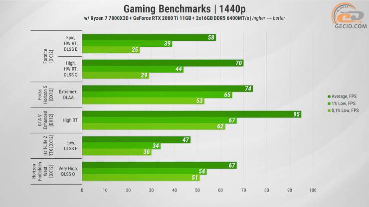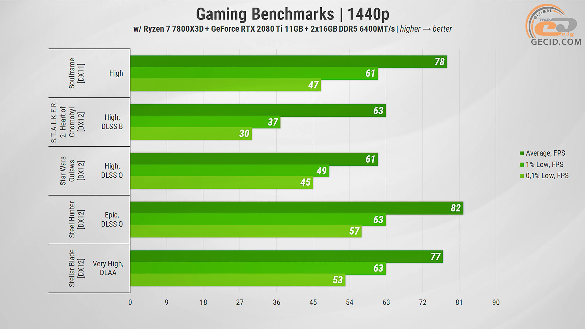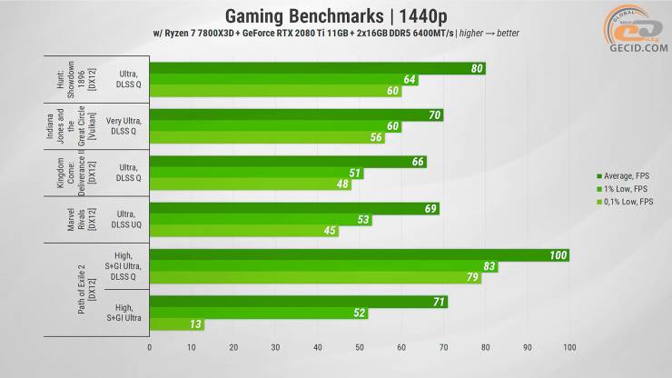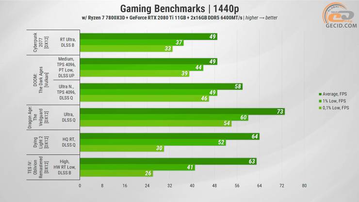 Звісно, для комфортного ігроладу в сучасних важких проєктах доводиться покладатися на DLSS, а іноді й знижувати налаштування графіки — особливо якщо мова йде про трасування променів чи погано оптимізовані тайтли. Однак у більшості випадків навіть на ультра пресетах RTX 2080 Ti, також завдяки 11-гігабайтному відеобуферу, забезпечує приємний FPS, зберігаючи гідний ігровий досвід. Але попри все приходиться миритися із вже застарілим PCIe 3.0, який може знижувати швидкодію, та дуже великим рівнем TDP, що дійсно сильно впливає на загальне енергоспоживання комп’ютера.