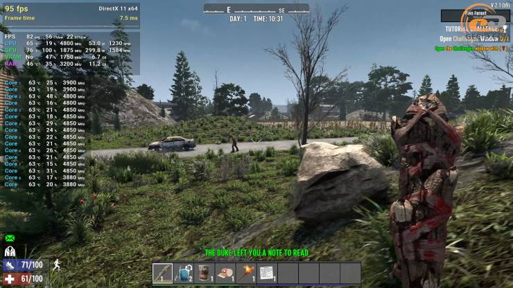 7 Days to Die на ультра якості бігається доволі бадьоро, хоча показник дуже рідкісних подій вказує на періодичні підгальмовування, які не впливають критично на ігролад. Проте оптимізація гри все так же потребує уваги від розробників, як то було й до релізу торік.