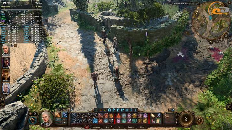 На RTX 2080 Ti у Baldur`s Gate 3 можна грати аж на ультра налаштуваннях графіки і з додатково покращеним DLAA згладжуванням. Навіть під час пересування густо населеним містом ніяких сюрпризів на нас тут не чекає — майже завжди лічильник FPS перевищує планку в 100 кадрів за секунду.