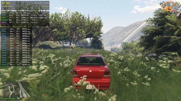 Дивлячись на оновлену версію Grand Theft Auto V, де розробники покращили якість різноманітних об’єктів і ефектів та додали нових барв з трасуванням променів, можна впевнено сказати, що навіть при максимальних налаштуваннях графіки RTX 2080 Ti справляється ідеально. Під час перегонів у місті картинка оновлюється з частотою у 100 разів за секунду, а поза межами населеного пункту в густій рослинності втрачається приблизно чверть FPS, хоча усе одно ігролад залишається приємним.