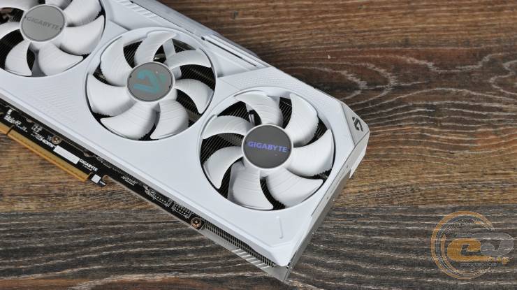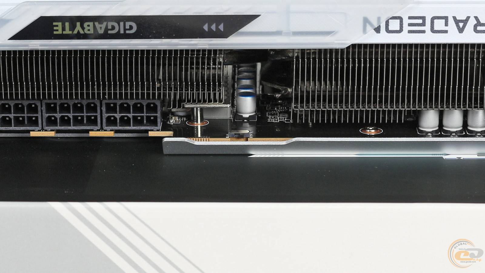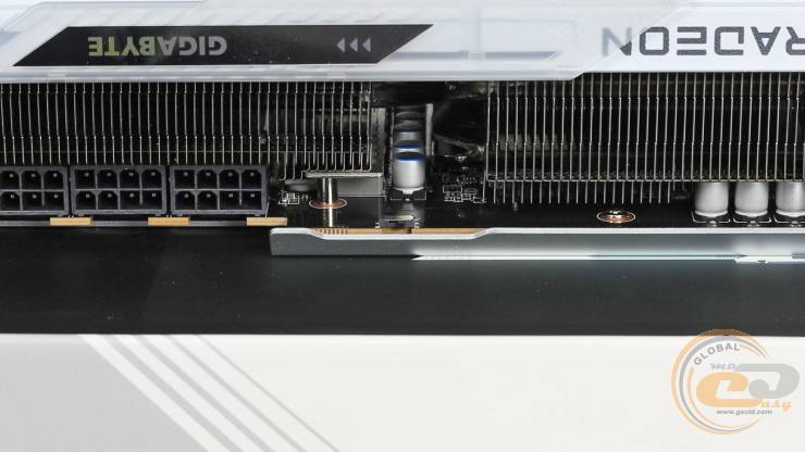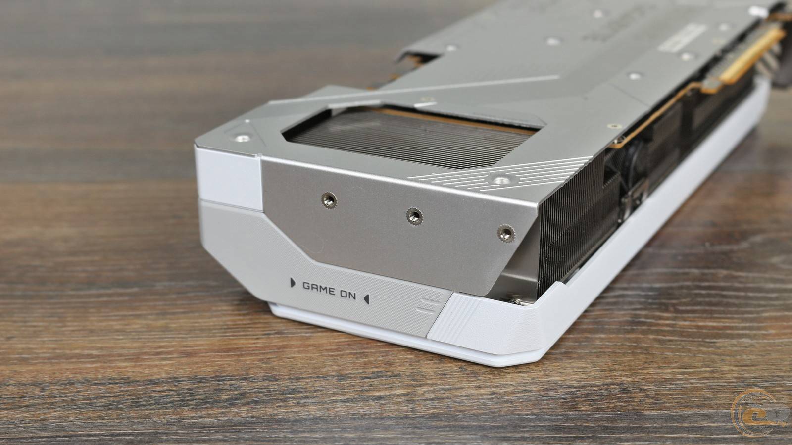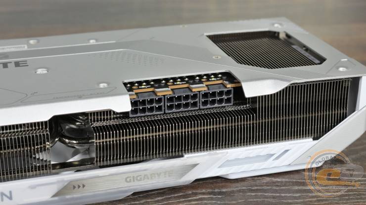 Інший виріз у тильній пластині зроблений для доступу до трьох старих-добрих 8-контактних роз’ємів живлення PCIe — сумнозвісного PCIe 5.1 тут немає. До речі, їх тут на один більше, аніж в еталонної версії, що цілком логічно для моделі із заводським розгоном. А поруч розташовані індикатори, які повідомлять у разі некоректного під’єднання кабелів живлення.