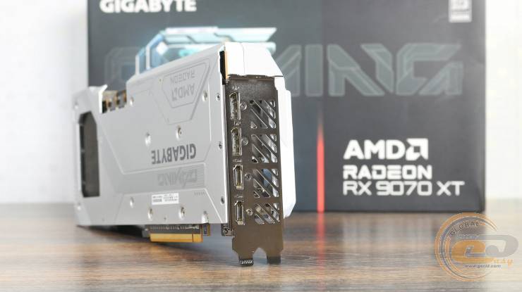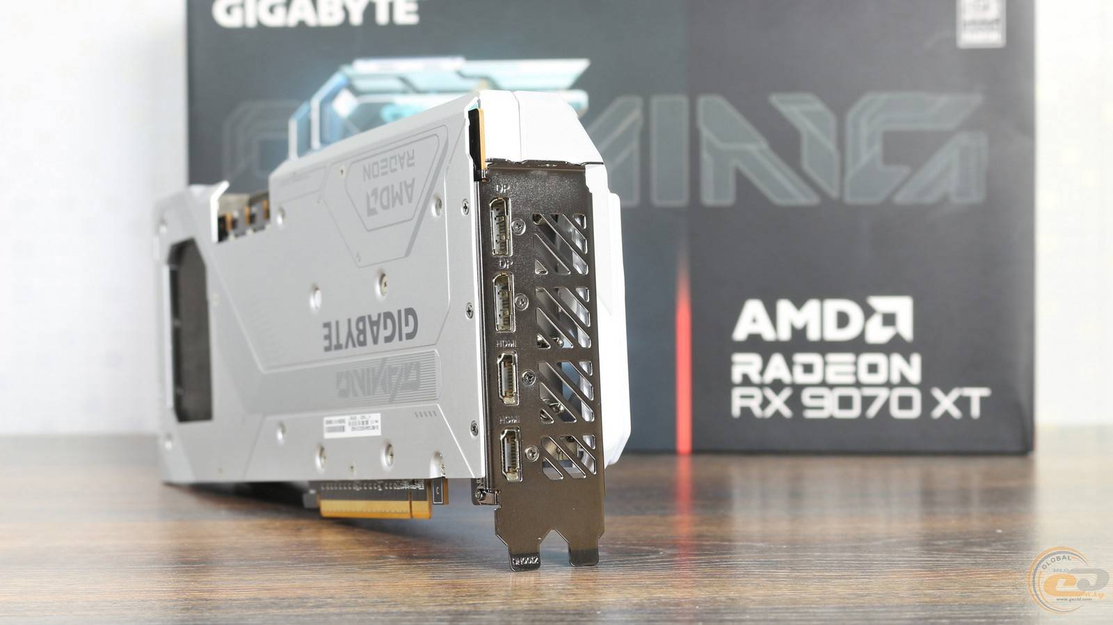 Набір зовнішніх інтерфейсів GIGABYTE Radeon RX 9070 XT GAMING OC ICE 16G дещо відрізняється від еталонного. Їх так само чотири, але конфігурація інша: замість одного HDMI та трьох DisplayPort тут встановлено по два порти кожного типу. Максимальна роздільна здатність вихідного сигналу сягає 7680 × 4320 пікселів, тобто 8K Ultra HD.