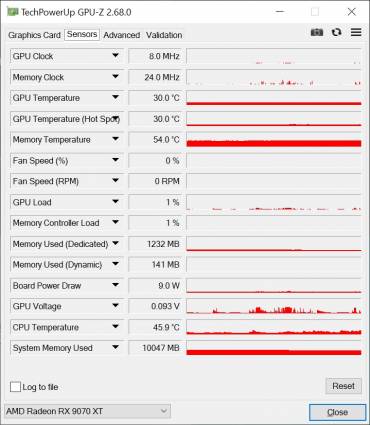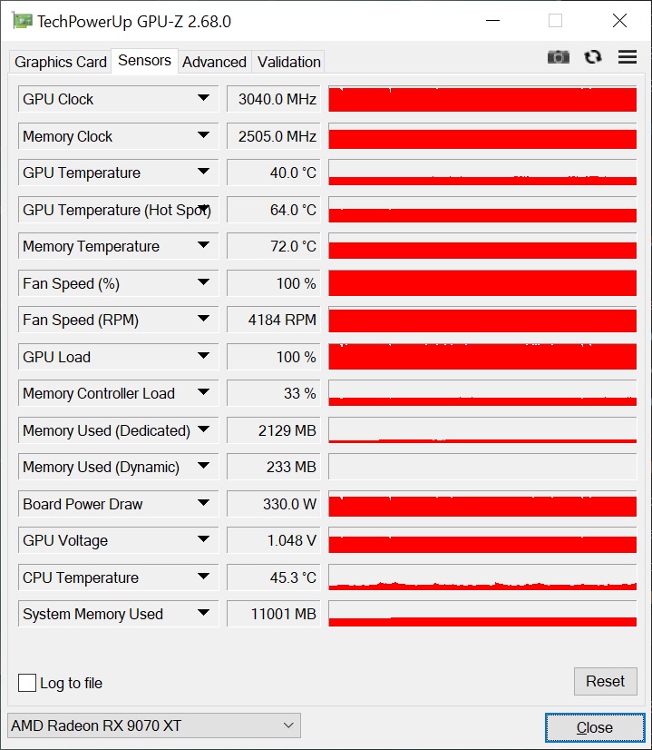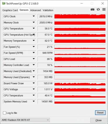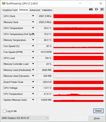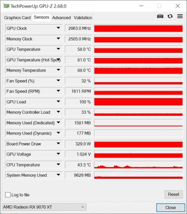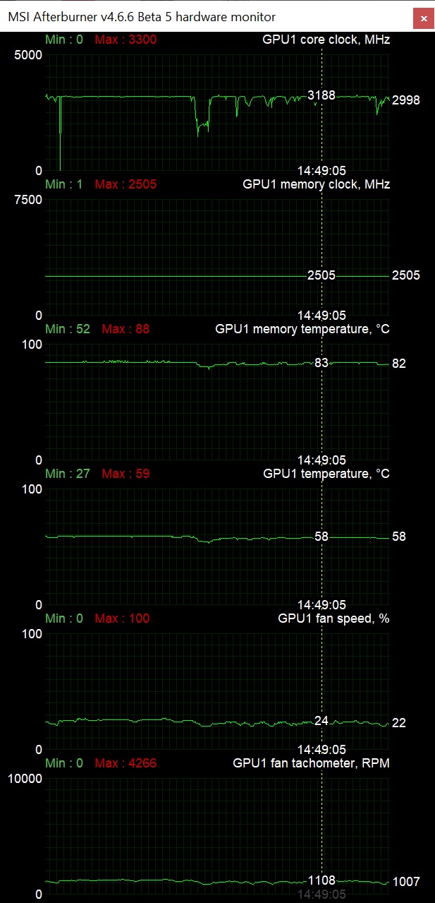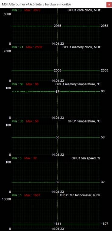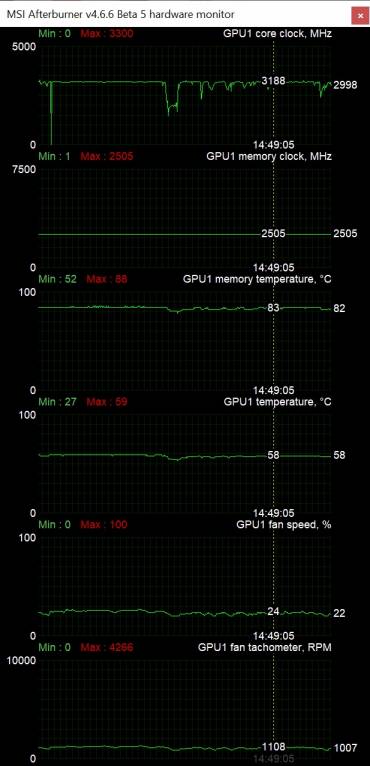 При автоматичному регулюванні швидкості пропелерів і максимальному навантаженні, графічне ядро нагрілося всього лише до 58°С, хоча показник Hot Spot досягає 81°С. Найгарячішою ж виявилася пам’ять — її температура піднялася до 88°С. Водночас швидкість вентиляторів стабілізувалася на позначці майже 1610 об/хв, що супроводжувалося комфортним шумом середнього рівня. Частота GPU становила 2963 МГц, що лише на 100 МГц нижче за максимальне значення «Boost».