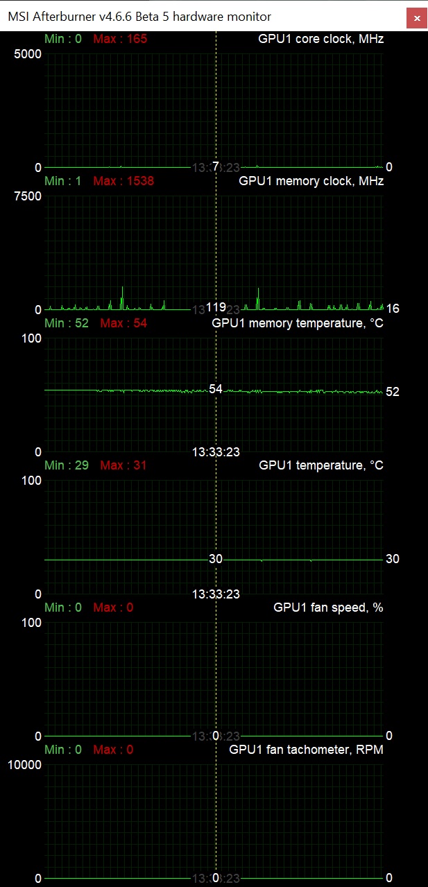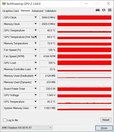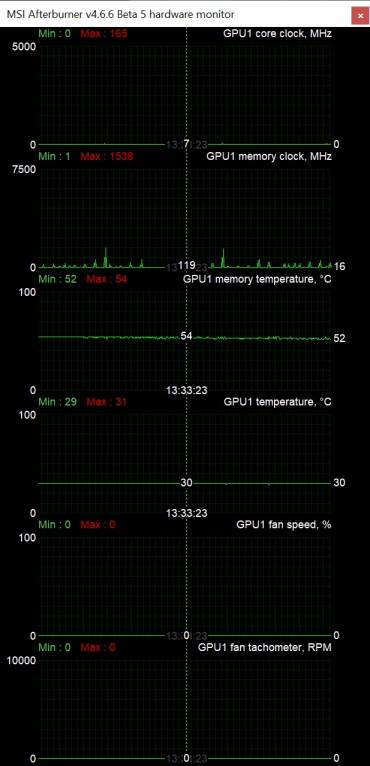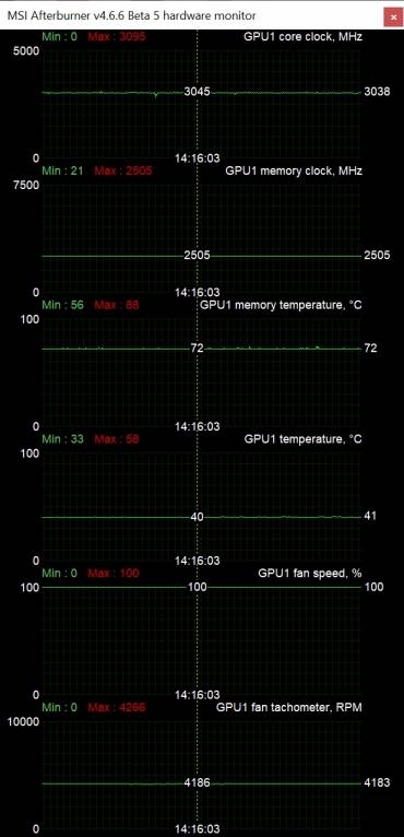 Після примусового встановлення швидкості обертання лопатей на максимальні майже 4200 об/хв, температура графічного процесора опустилася до 40°С, а пам’яті — до 72°С. Це показує відмінний запас можливостей системи охолодження, але шум в такому режимі високий і некомфортний. При цьому частота GPU практично відповідає заявленому показнику «Boost».