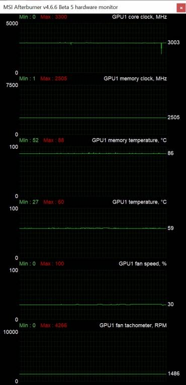 При переході до роздільності 4K Ultra HD пропелери розігналися майже до 1500 об/хв, температура графічного процесора піднялася до 59°С, пам’яті — до 86°С, а частота GPU становила практично 3000 МГц.