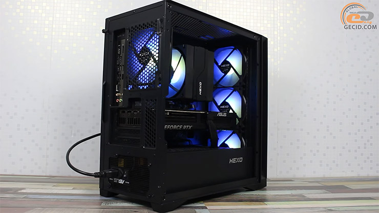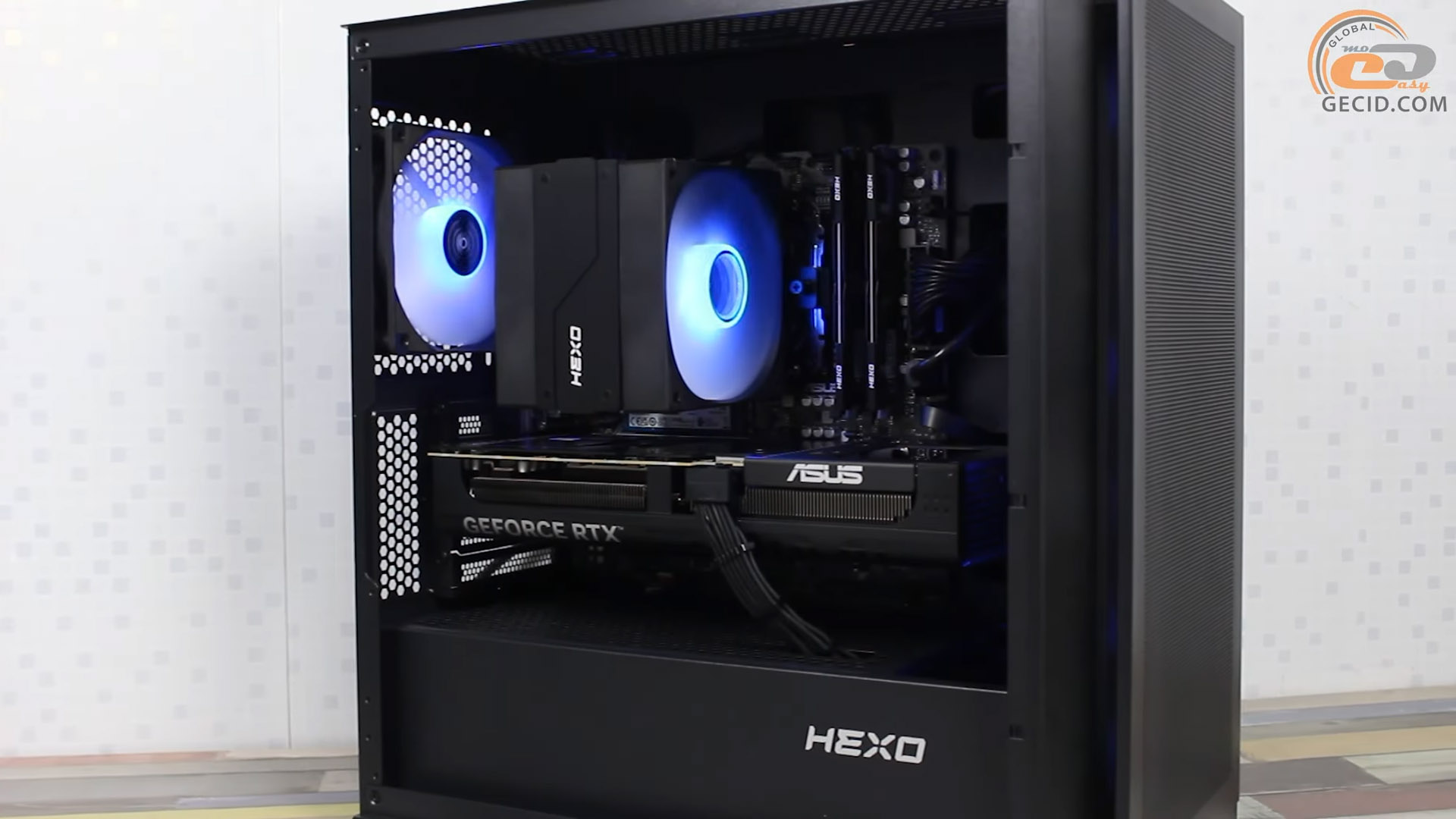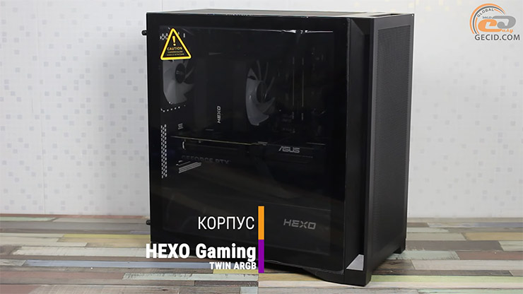 Усі комплектуючі розміщені в корпусі HEXO Gaming TWIN ARGB. Це стильний невеликий Mid Tower зі скляною боковою панеллю у двокамерному виконанні, тобто з коробом для блока живлення знизу, що загалом покращує охолодження компонентів.