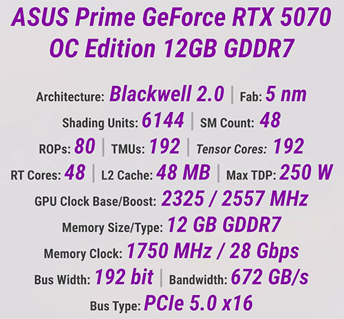 Графічний чіп моделі налічує 6144 CUDA-ядра, 192 текстурних модулі, 80 блоків растеризації, 48 RT-ядер нового покоління та 192 тензорних ядра. Базова частота GPU складає 2325 МГц, а у режимі буста піднімається до 2557 МГц. Відеопам’ять — 12 ГБ GDDR7, із 192-бітною шиною, що забезпечує пропускну здатність в 672 ГБ/с, а швидкі мікросхеми дають хороший запас на майбутні ігри з важкими текстурами.