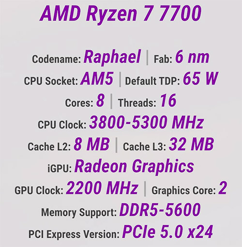 В якості основного процесору тут обраний досить популярний та багатьом знайомий за можливостями 8-ядерний 16-потоковий AMD Ryzen 7 7700 із архітектурою Zen 4.