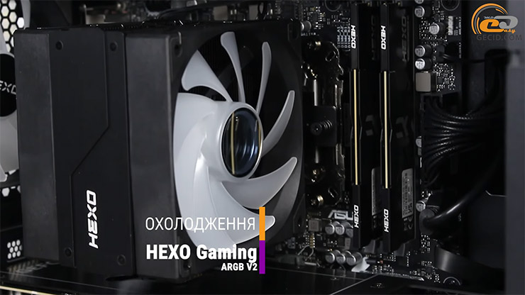 За охолодження процесора відповідає представник власної дистрибуції Telemart.ua — повітряний кулер HEXO Gaming ARGB V2. Це охолоджувач зі стриманим дизайном, який прикрашений парою яскравих 120-мм вентиляторів. Їхня швидкість регулюється саме у цьому ПК в діапазоні приблизно 800–1500 об/хв, тож можна очікувати адекватний баланс між продуктивністю та рівнем шуму.