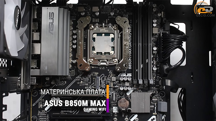 Материнська плата ASUS B850M MAX GAMING WIFI у цій збірці виступає як міцна та сучасна основа під платформу AM5. Вона отримала оновлений чипсет B850, потужну 8+2+1-фазну підсистему живлення з масивними радіаторами та повну підтримку швидкої DDR5-пам’яті. Попри формат microATX, плата має все необхідне для ігрової системи: армований PCI-E 5.0 на 16 ліній призначений для відеокарти та три M.2-слоти, один з яких працює на PCI-E 5.0 і підходить для найшвидших SSD.