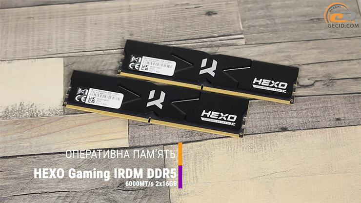 ОЗП тут також брендована — 32 ГБ DDR5-6000 HEXO Gaming IRDM DDR5 6000MT/s 2x16GB (IRK-HX60D564L30S/32GDC), набрана комплектом із двох модулів. Кожна планка отримала фірмовий мінімалістичний радіатор із логотипом HEXO, а за своїм походженням легко здогадатися, на чиїх рішеннях вона базується — проскакує почерк Goodram.