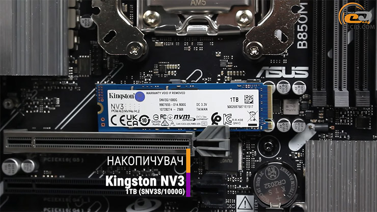 Зберігання даних покладено на «народний» Kingston NV3 об’ємом 1 ТБ. Це NVMe SSD з інтерфейсом PCI-E 4.0 x4, який чудово підходить для встановлення ОС, ігор та повсякденних додатків. Забезпечує він швидкості до 6000 МБ/с на читання та до 4000 МБ/с на запис. Модель відноситься до доступного сегмента, але при цьому має непогану витривалість – до 320 TBW.
