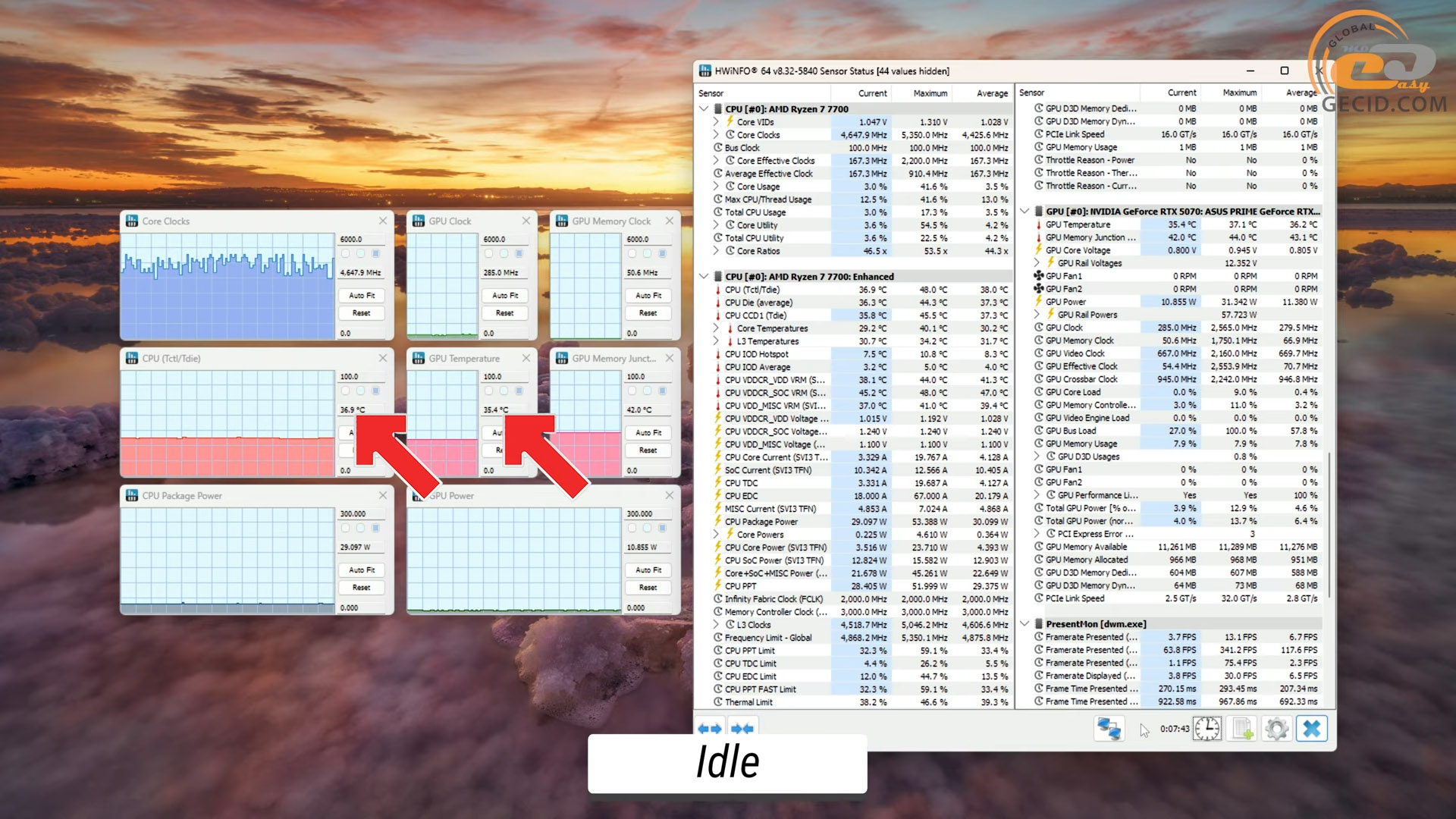 Почнемо з прогріву. Без суттєвого навантаження на ПК все тихо і спокійно — температури CPU та GPU у нормі — біля 36 градусів Цельсія відповідно на обох.
