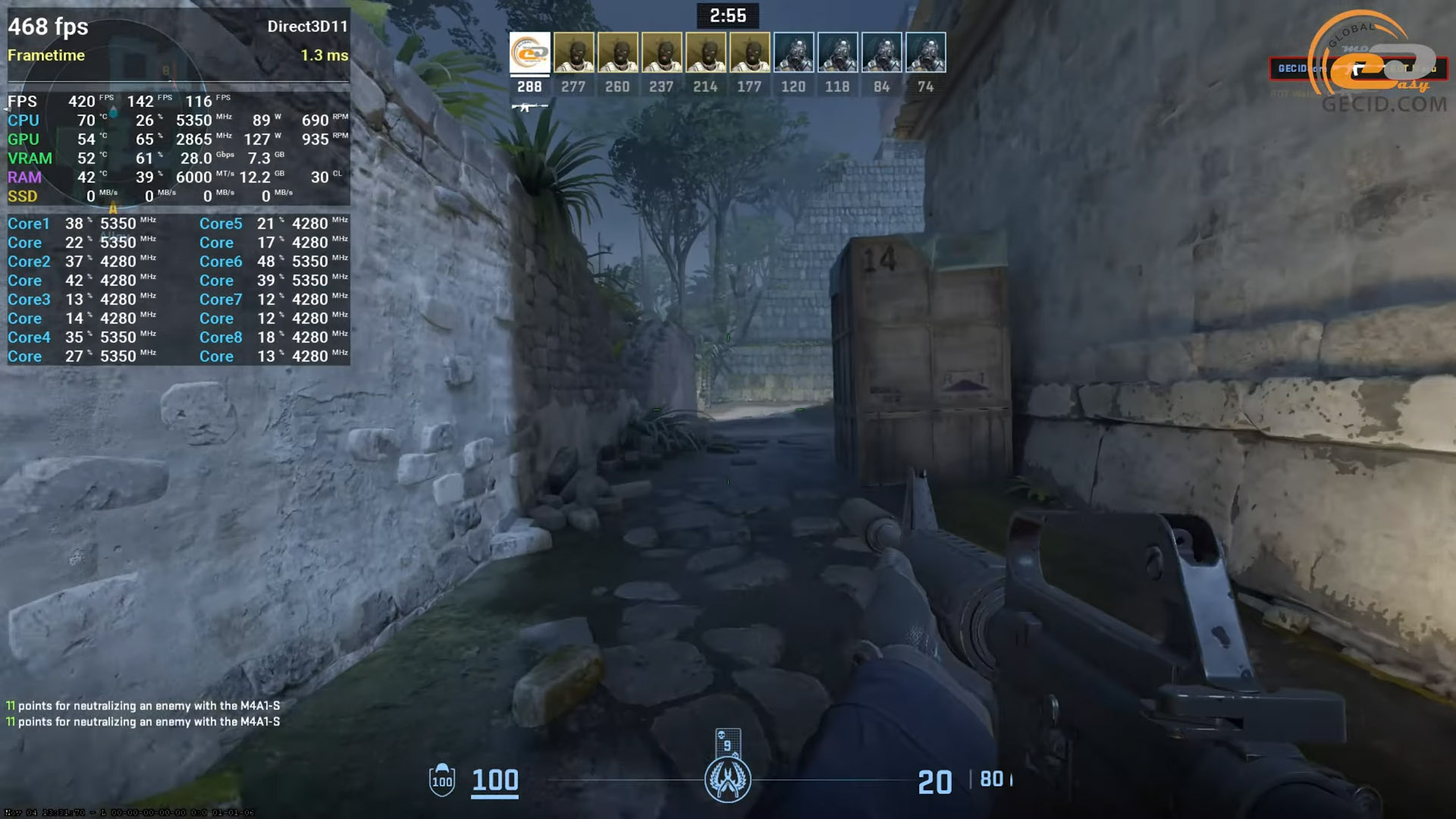 Побігати на нічному Ancient в Counter-Strike 2 можна без жодних проблем навіть на дуже високих налаштуваннях. За такого, доволі нетипового для більшості гравців пресету, система видає понад 300 FPS у середньому. Проте варто звернути увагу й на показник дуже рідкісних подій: він помітно нижчий за середній — приблизно утричі, тож подекуди можуть проскакувати легкі посмикування. Вони не критичні, але повністю рівним геймплей через їх наявність назвати не можна.