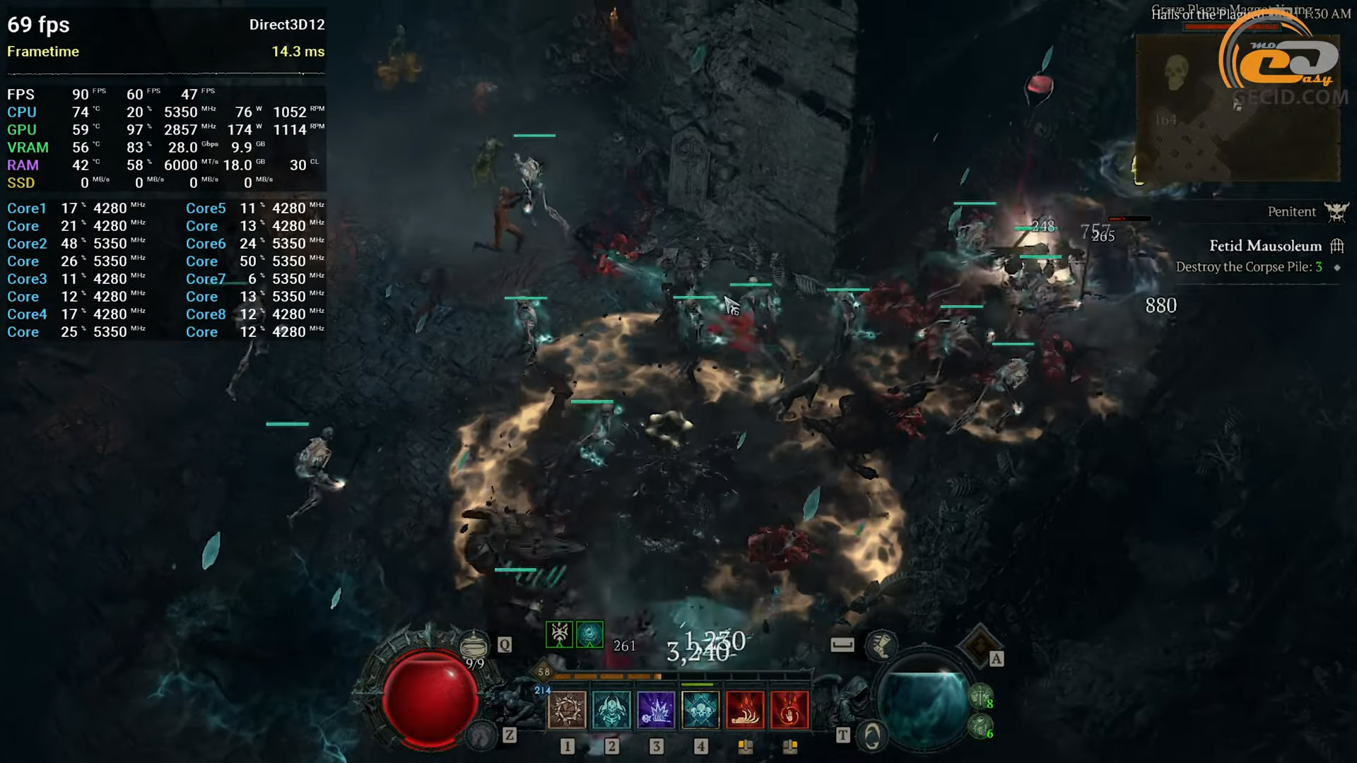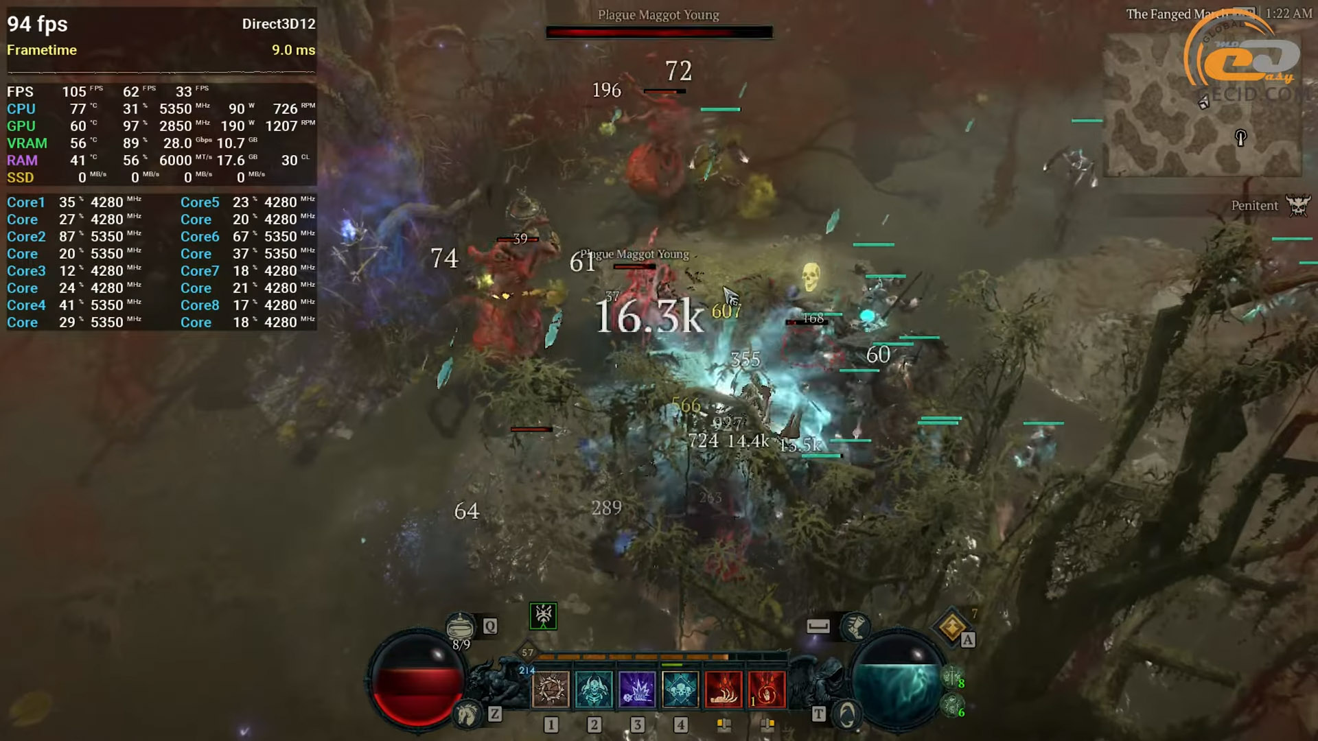 Піддослідна система надає майже достатньо ресурсів для подолання Diablo IV на RT Ultra пресеті графіки. У перші хвилини гри можуть траплятися незначні проблеми з плавністю — рушій поступово кешує дані і звикає до локації. Далі геймплей стає стабільнішим і все відчувається цілком комфортно, але переважно вдень: у світлих зонах навантаження нижче, і це добре помітно.
