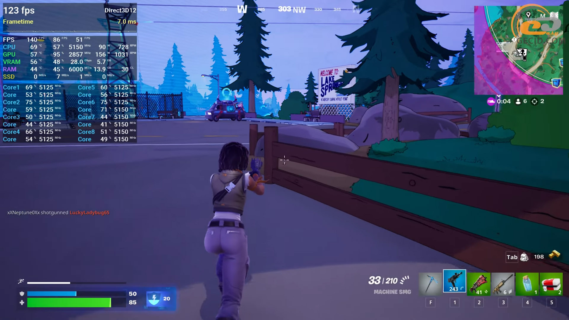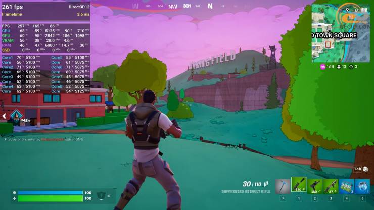 З апдейтом у стилістиці «Сімпсонів» Fortnite зараз виглядала доволі легкою задачею для відеокарти, але трасування променів усе ще робить своє. На максимальних налаштуваннях із ввімкненим апаратним RT система видає в середньому 140 FPS, а показник дуже рідкісних подій вказує на просадки в район 56 оновлень екрану за секунду. Тобто геймплей у цілому плавний, але іноді ривки все ж можливі, особливо коли рушій активно підвантажує геометрію чи ефекти.