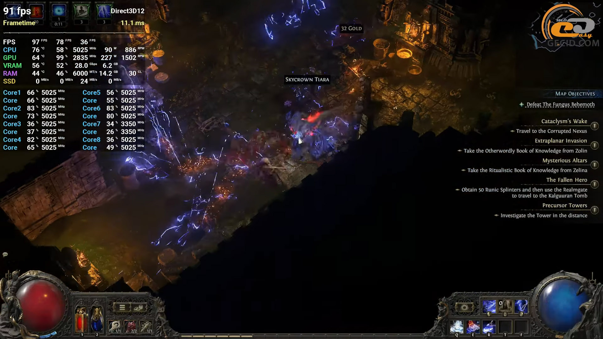 Побігати в активну Path of Exile 2 можна без жодних проблем — гра чудово тримається на високих налаштуваннях із ультра якістю тіней та глобального освітлення. Приємно, що навіть під час великої кількості ефектів на екрані частота кадрів залишається на комфортному рівні. Хоча цього разу мапа була не найважча — як у плані візуального навантаження, так і за кількістю монстрів — система все одно демонструє себе з дуже хорошої сторони, тому і в найважчих сценаріях усе буде ОК.