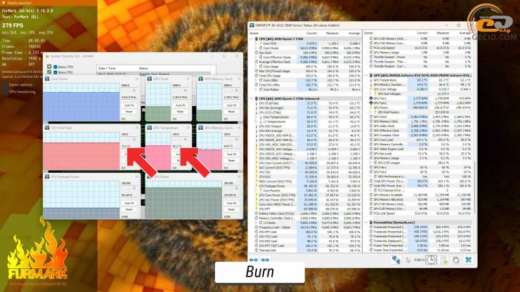 При стресовому навантаженні у FurMark процесор та відеокарта розігріваються до температур у 72 та 65 градусів відповідно. При цьому частоти графічного процесора коливаються біля 2350 МГц.