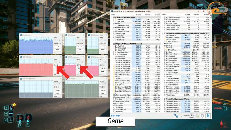 Під час гри ситуація майже не змінилась - процесор охолонув на один, а відеокарта на половинку градуса. Проте робочі частоти відеокарти піднялися до позначки майже в 2800 МГц.