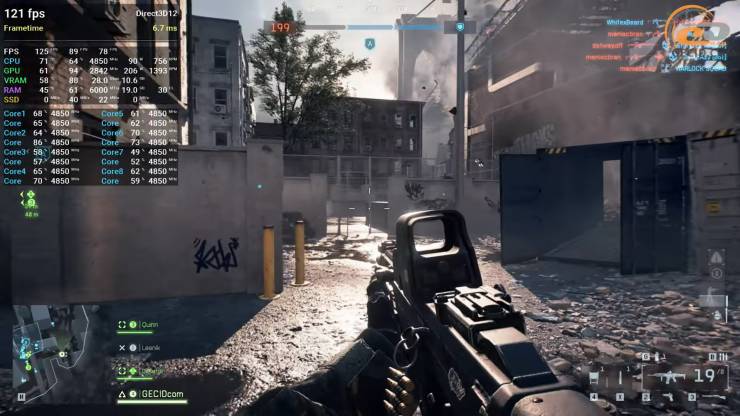 Battlefield 6 на пресеті Overkill спершу почувається чудово: гра йде плавно, середня частота кадрів тримається біля 120-ти, і система витягує навіть найгарячіші моменти масштабних зіткнень. Але через деякий час починають з’являтися легкі підтупи, і причина тут доволі очевидна — відеопам’яті забагато не буває. Індикація в меню червоніє, показуючи понад 13 ГБ використаної VRAM, тоді як RTX 5070 має лише 12, і це час від часу дає про себе знати. Щоб позбутися подібних моментів, достатньо або знизити налаштування до ультра рівня або ж ввімкнути DLSS в режимі Quality. Обидва варіанти не псують картинку, але помітно стабілізують геймплей.