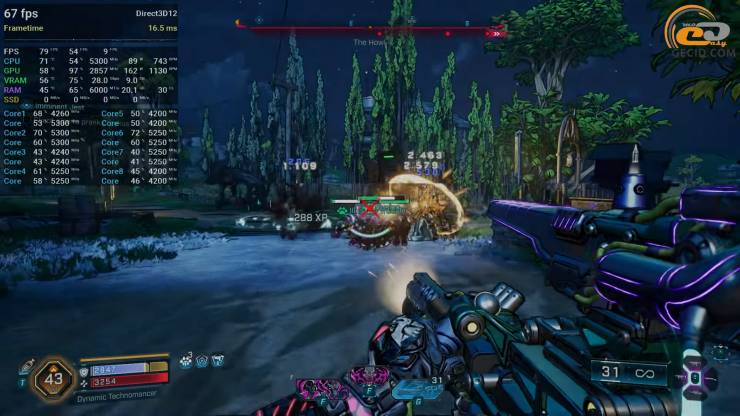 Проходити нову частину серії ігор Borderlands можна на дуже високому пресеті графіки разом із доданим DLSS в якісному режимі. Таким чином маємо майже найякіснішу картинку, але із мінімалістичним запасом частоти кадрів для найважчих сутичок з ворогами. Втім, гра періодично підгальмовує, і це не разові стрибки, а повторювані мікролаги, які не зникають навіть після повторних «пробіжок» локаціями. Схоже, рушій часом наполегливо підвантажує дані або агресивно працює з потоками, тому остаточна плавність періодично кульгає.