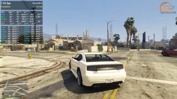 Також варто подивитися на продуктивність у покращеній версії п’ятої GTA. Тут все працює чудово. Продуктивність упирається хіба що в ліміти енергоспоживання процесора, а відеокарта працює лише на 70 відсотків своїх можливостей, через що частота кадрів на відкритих зелених локаціях практично не відрізняється від міських сцен — інколи навіть стає вищою. Проте загалом геймплей максимально плавний і без просідань.