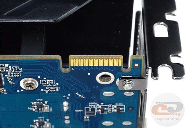 Крім слота PCI Express х16, живлення відеокарти забезпечується через один додатковий 6-контакний роз’єм, розташований на торці графічного адаптера. Через нависаючий довгий кожух доступ до нього трохи незручний.
