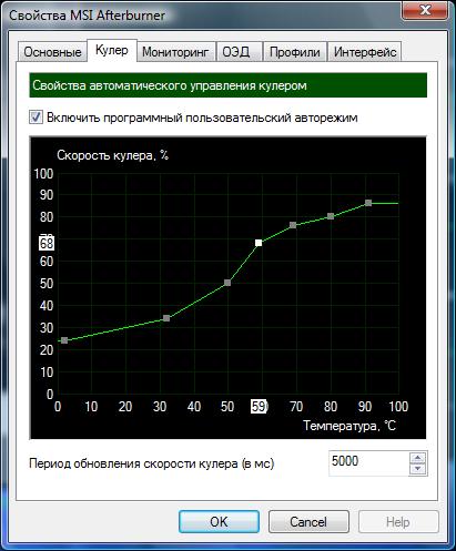 Є цікаві можливості з налаштування режимів роботи вентиляторів системи охолодження. Залежність швидкості від нагрівання GPU можна задавати вручну, а також зробити зміну швидкості обертання плавним або східчастим чином залежно від нагрівання.