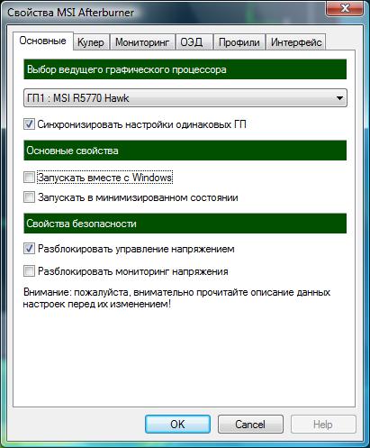 Тут можна вибрати провідний графічний процесор, встановити режим синхронізації налаштувань для двох однакових відеокарт. Вибрати можливість автоматичного запуску утиліти при старті операційної системи і її режим запуску. Можна відключити або включити керування напругою GPU, а також його моніторинг.