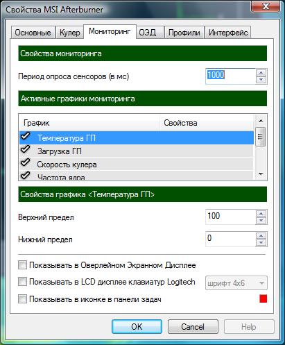 Можна змінювати властивості моніторингу, задаючи період опитування сенсорів (у мс), включати або відключати графіки моніторингу, змінювати властивості графіка температури ГП, задаючи верхню і нижню межу осі моніторингу. Тут же можна задавати способи виведення необхідних величин моніторингу на: Оверлейном Екрані Дисплея, в LCD-дисплеї клавіатур Logitech, показувати в іконці панелі завдань. Для зручності можна встановити розмір шрифту виведених значень і їх колір.