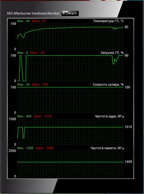 При розгоні була піднята напруга на GPU до 1325 мВ. При максимальній швидкості обертання вентиляторів турбіни - 4800 об/хв, спостерігався сильний рівень шуму, але виставивши автоматичний режим ми одержали температуру близько 87 °С у стані розгону з цілком комфортним рівнем шуму, який забезпечувався 80% швидкості обертання вентиляторів.