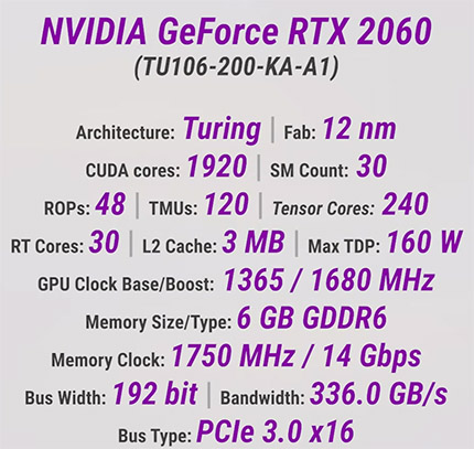 За підсистему відеопам’яті відповідають 6 ГБ GDDR6 з ефективною швидкістю 14 Гб/с на контакт. Пам’ять працює через доволі широку 192-бітну шину, що дає пропускну здатність на рівні пристойних у сегменті 336 ГБ/с. Рівень енергоспоживання у RTX 2060 помітно скромніший за старші моделі лінійки — заявлений TDP становить 160 Вт, що робить карту доволі невибагливою до блока живлення. Також варто відмітити, що використання інтерфейсу PCI-Express 3.0 на 16 ліній може додатково погіршити продуктивність у разі нестачі VRAM.